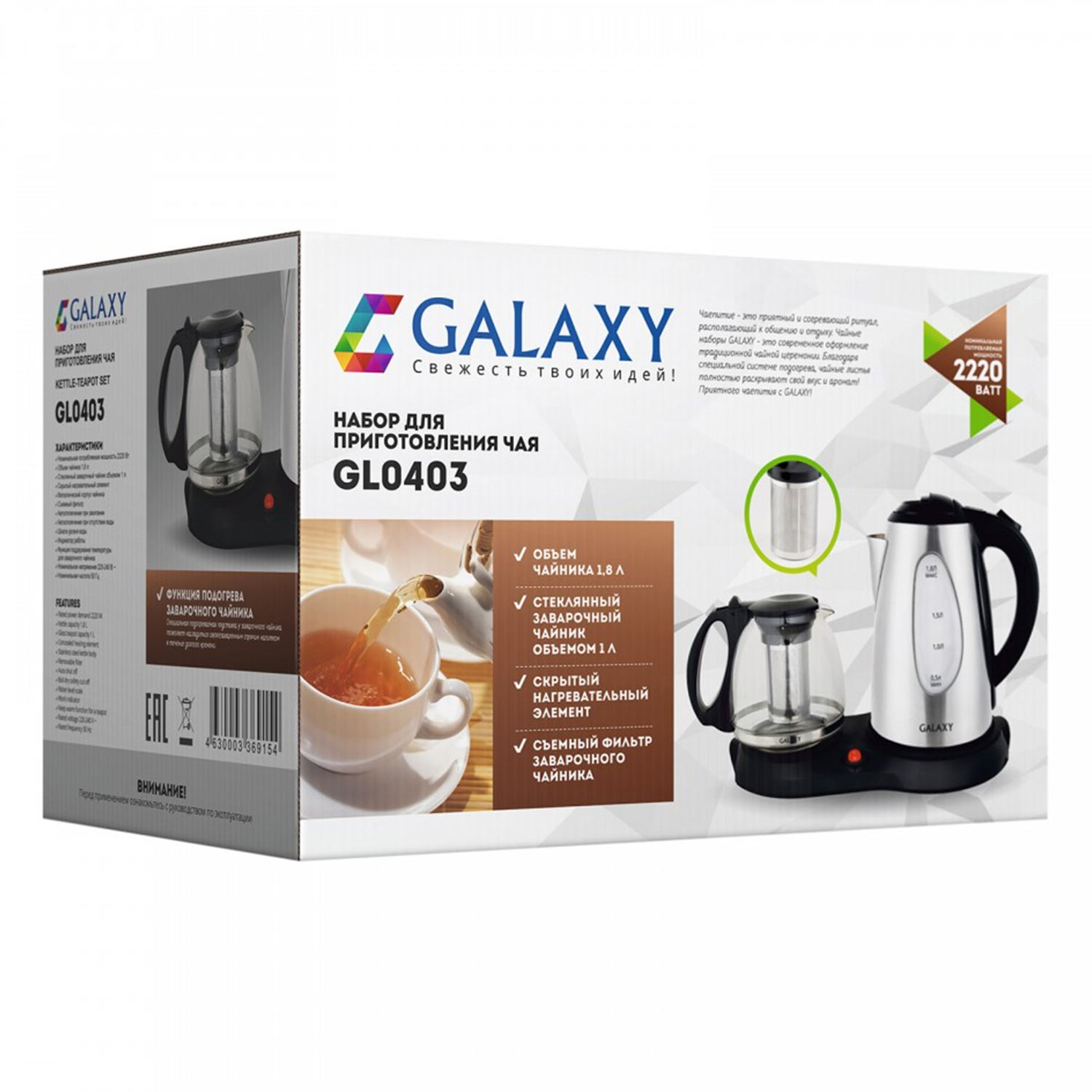 Набор д/пригот.чая Galaxy LINE GL0403, 2220Вт, чайник - 1,8л, стекл.завароч.чайник - 1л