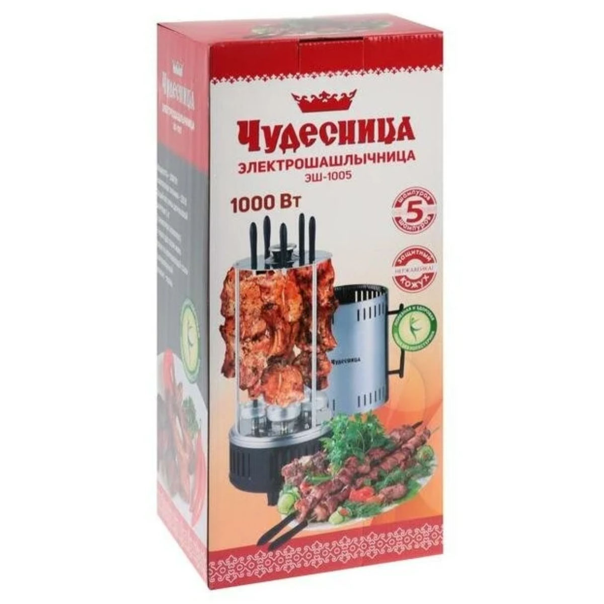 • Мощность 1000 Вт, керамический нагревательный элемент, 5 шампуров.