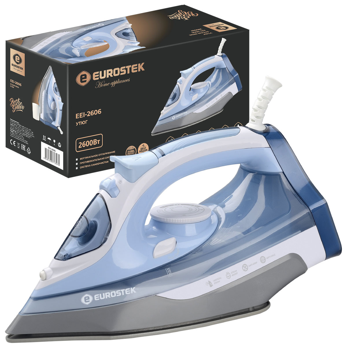 Утюг эл. Eurostek EEI-2606, мощность 2600В, система самоочистки, встроенная защита от накипи