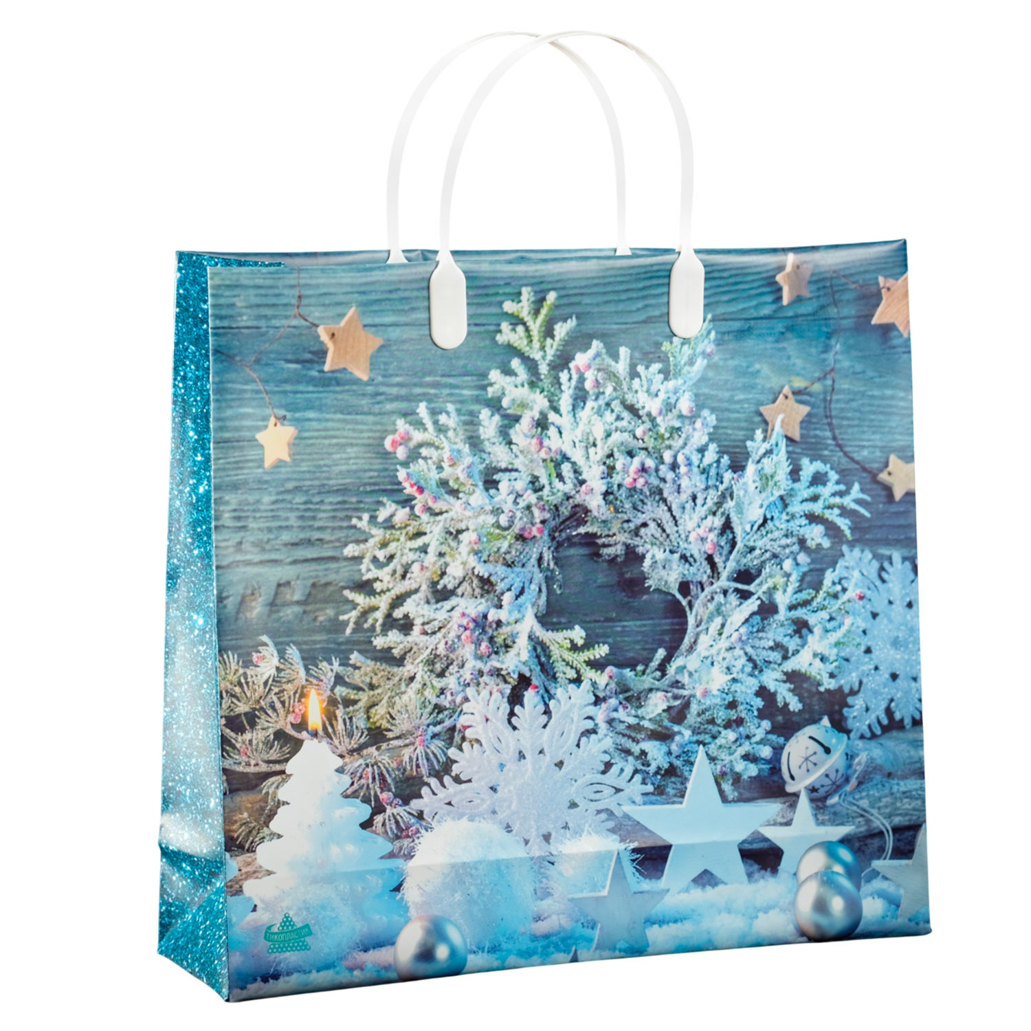 Пакет НГ СОФТПЛАСТ с пласт. ручкой 30*30см, 140мкм, мягк.пластик, Снежинки на бирюзе Тико