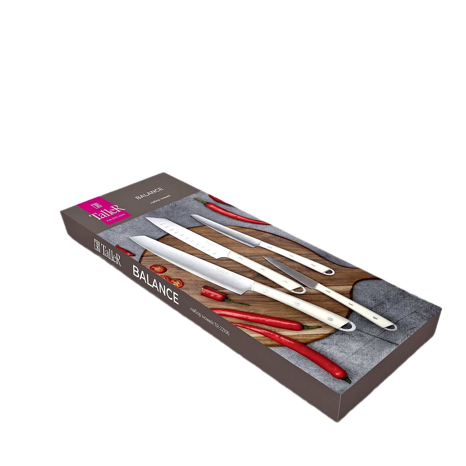 Набор ножей TalleR TR-22106 "Баланс» — универсальный кухонный комплект для ежедневного использования. Острые лезвия из нержавеющей стали AISI 420S45 (3Cr13) обеспечивают лёгкий, точный рез и устойчивость к коррозии. Даже при регулярной эксплуатации режущая кромка остаётся надолго острой.Удобные рукоятки из прочного пластика имеют мягкую матовую поверхность и выполнены в элегантном молочном цвете. Благодаря анатомической форме ножи комфортно лежат в руке, не скользят, а наличие отверстий в ручках позволяет хранить их подвешенными.