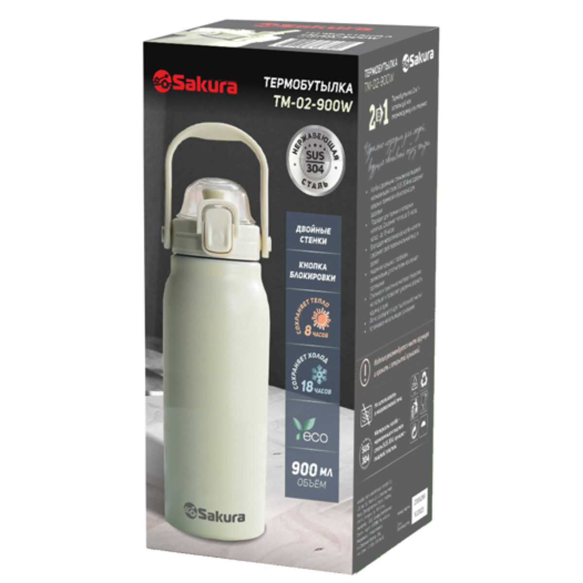 -Термобутылка 0,9л TM-02-900W 2в1 с трубочкой, кремовый