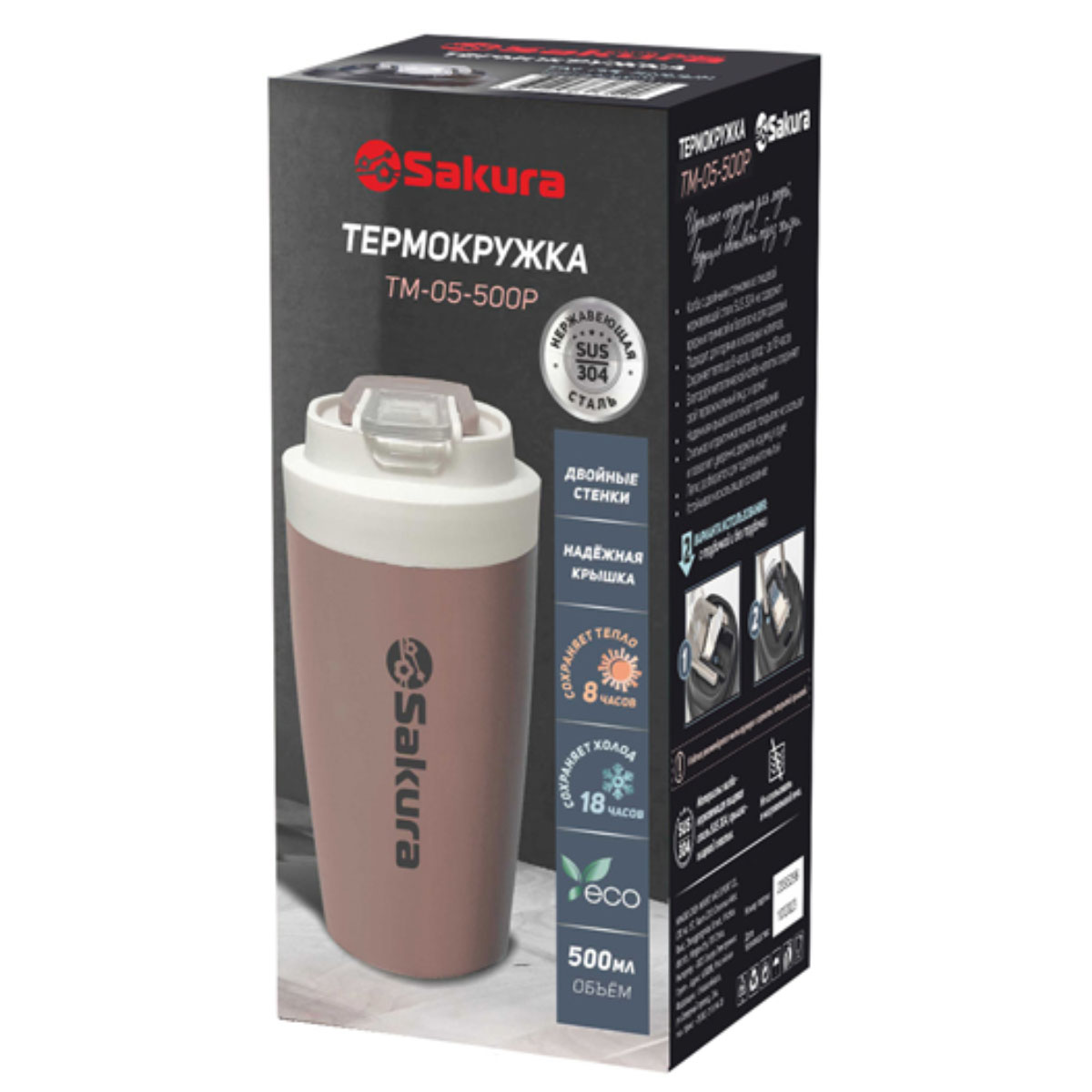 Термокружка 0,5л TM-05-500P с трубочкой, пепельная роза
