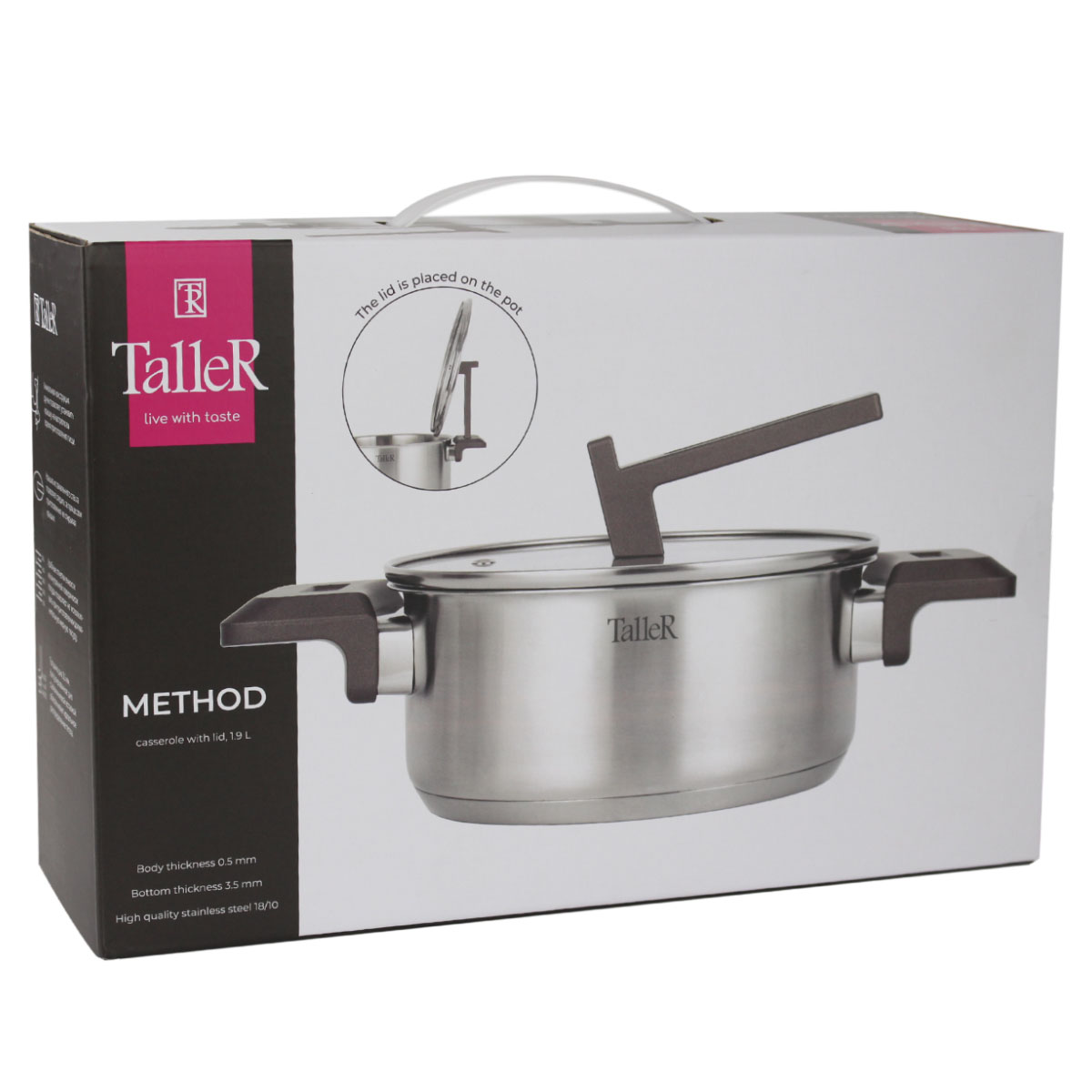 Кастрюля TalleR TR-17307 "Метод» объёмом 1,9 литра — стильная и практичная модель из высококачественной нержавеющей стали 18/10 с капсулированным дном толщиной 3,5 мм для равномерного распределения тепла. Толщина стенок 0,5 мм и матовая полировка внутри и снаружи делают посуду прочной и эстетичной. Внутри нанесены удобные отметки емкости для точного контроля.