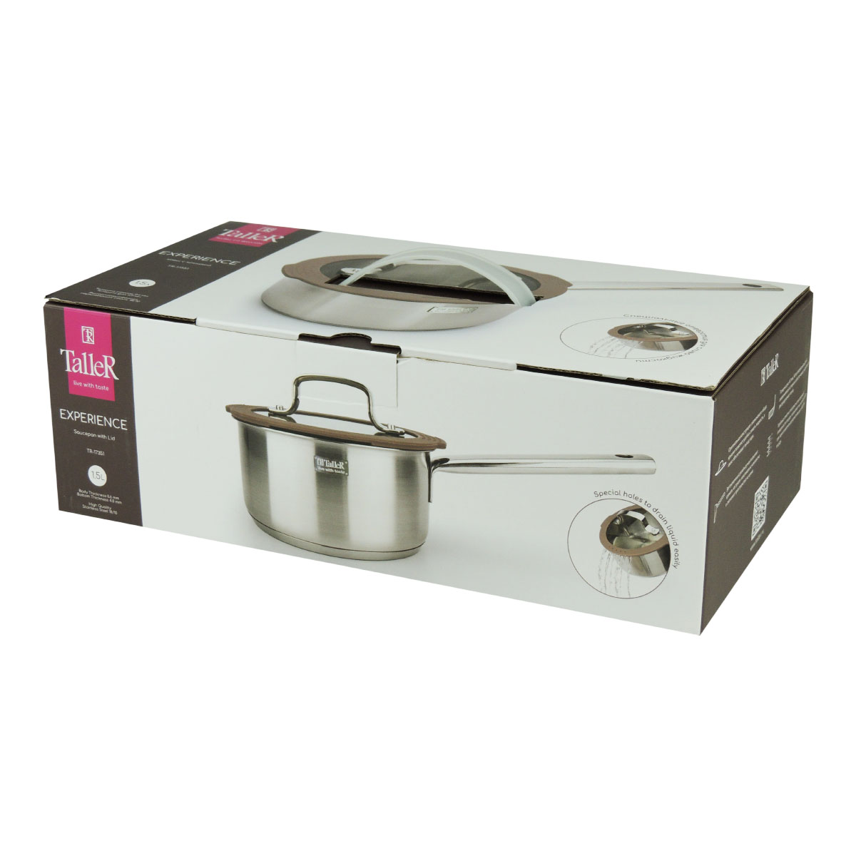 Ковш TalleR TR-17351 "Экспириенс» объёмом 1,5 л — практичная и функциональная модель из высококачественной нержавеющей стали 18/10 с матовой полировкой внутри и снаружи. Капсулированное дно толщиной 4 мм обеспечивает равномерное распределение тепла, а стенки толщиной 0,6 мм — прочность и лёгкость конструкции.