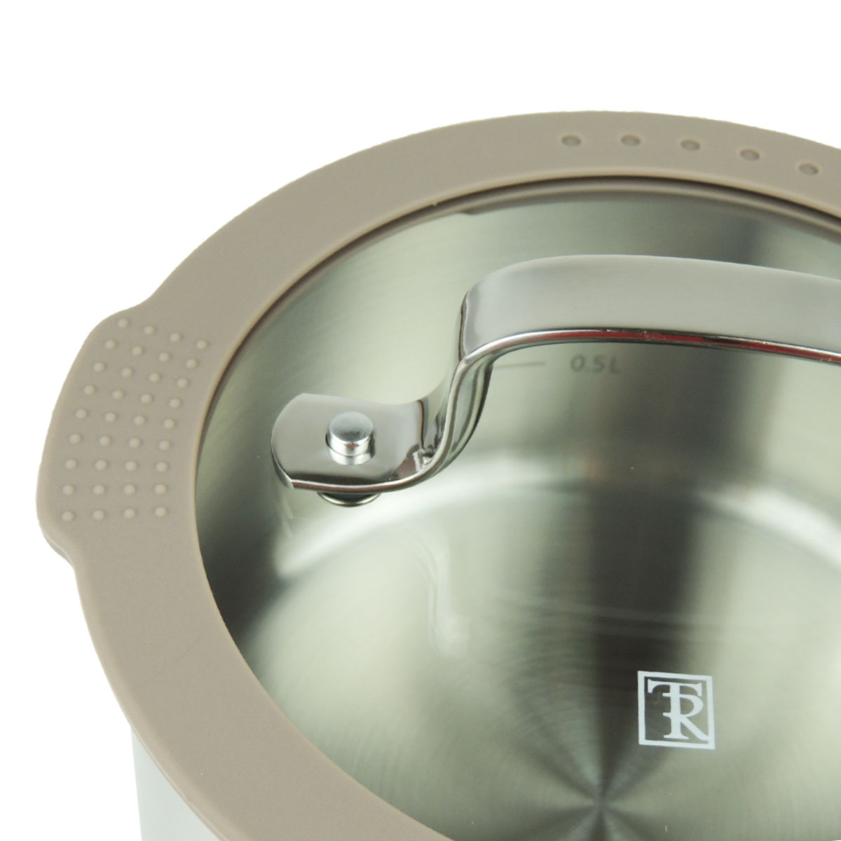 Особенность ковша — комбинированная крышка из закалённого стекла с силиконовым ободом, который обеспечивает удобный слив жидкости и выход пара, а также бережно защищает посуду и кухонные поверхности от царапин и сколов. Цвет крышки — светло-коричневый. Ручка из нержавеющей стали на точечной сварке надежна и устойчива к нагреву. На внутренней стенке есть отметки литража для удобства использования.