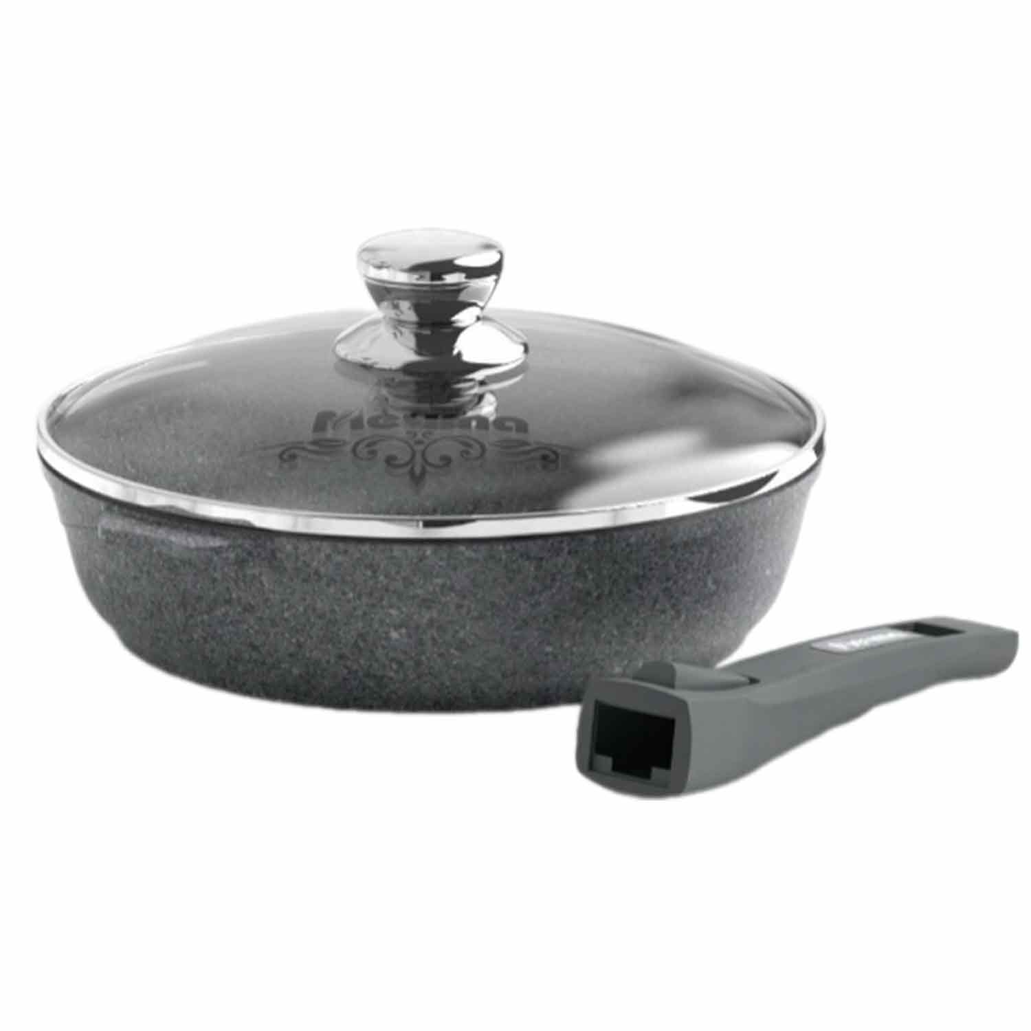 Антипригарное покрытие обеспечивает приготовление без масла и лёгкий уход. Съёмная ручка позволяет использовать сковороду в духовке и экономить место при хранении. Стеклянная крышка удерживает тепло и влагу.